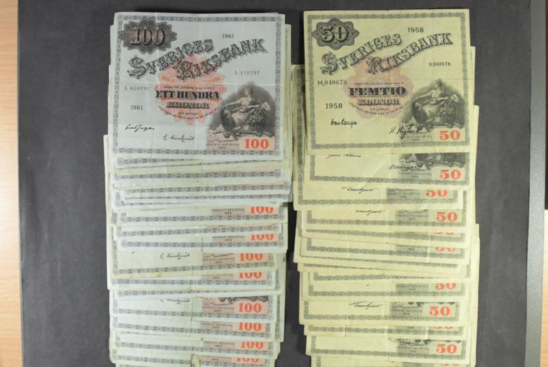 Sweden, One box with Swedish banknotes, 5–500 kronor, 12500 kronor in face value, mixed quality.