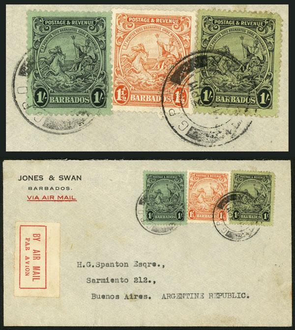 TWIN VALUES: Cover sent to Argentina on 30/MAR/1932 (I do not give guarantees about the date, it is barely visible) with spectacular postage combining 2 DIFFERENT stamps of 1sh.: Sc.175a (black on emeral, COMPOUND perf 13½x12½) with Sc.176 (brownish black on yellow-green), along Sc.168. Extremely rare franking of twin values, excellent quality! (Image)