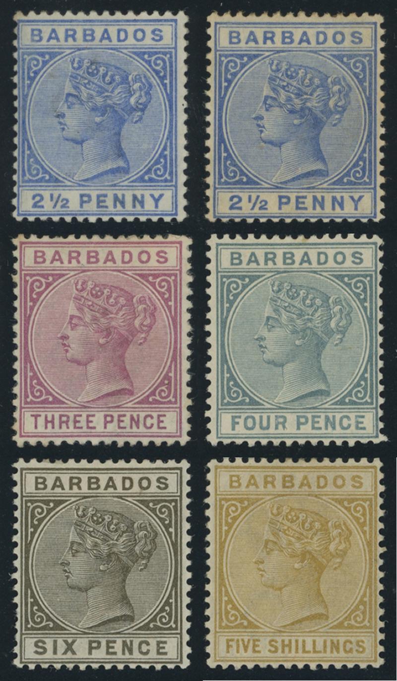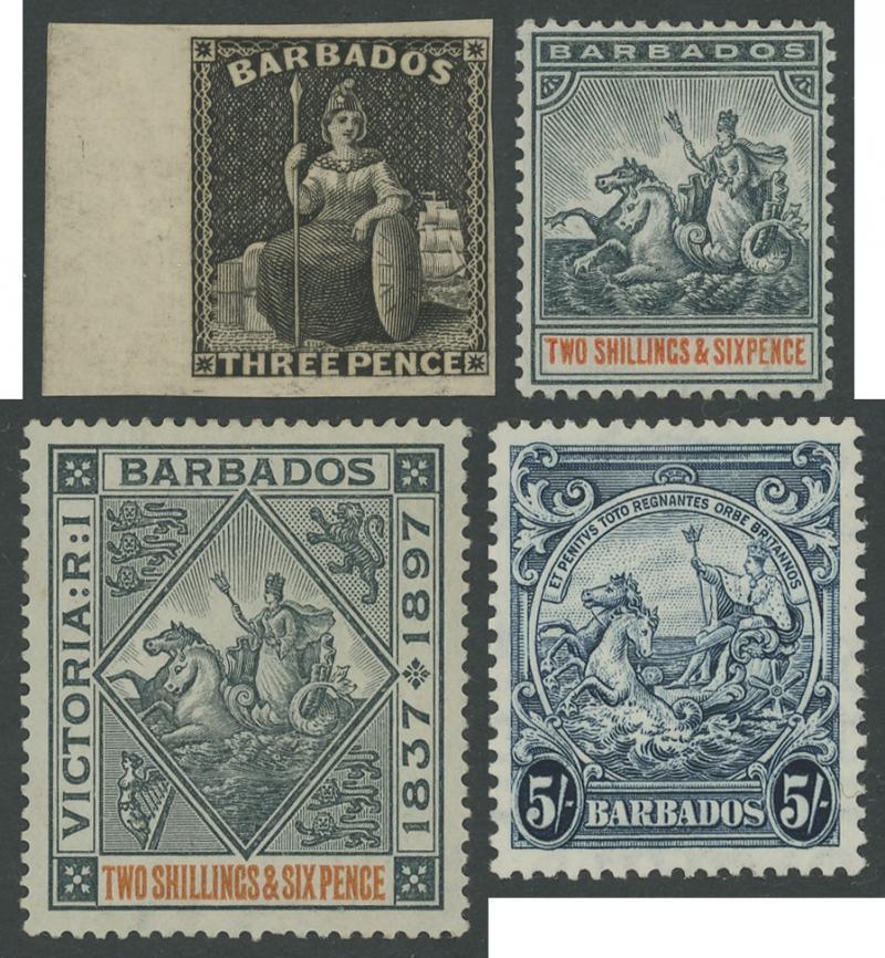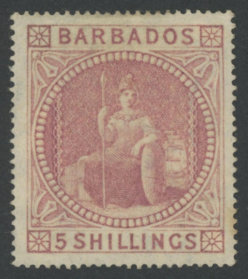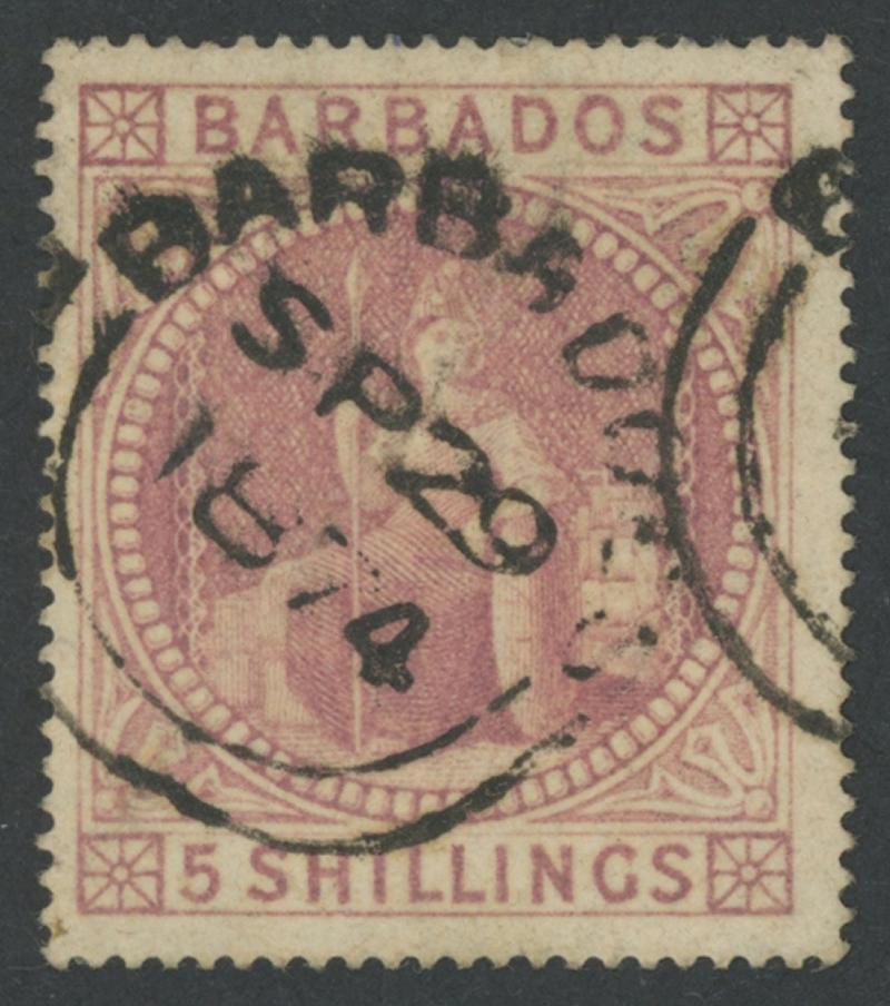 1873 Britannia Small Star Watermark (Sideways) 5/- dull rose SG 64, fine used with largely very fine almost-complete 'BARBADOES/SP29/1874' cds cancel, Cat £300. A Brun guarantee handstamp in reverse. (Image1)