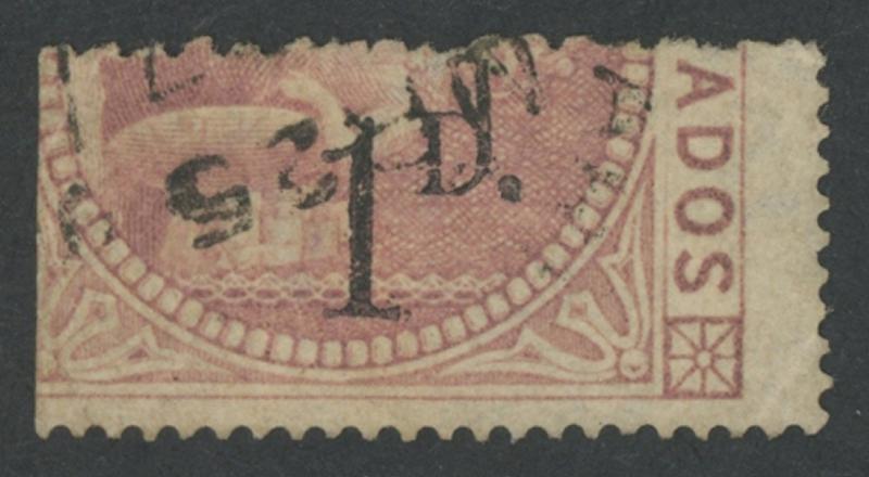 1878 Surcharges on Britannia 5/- dull rose Divided Vertically by Perforations and Value Tablet Severed '1 D.' Type 3a Overprint SG 86 on the left-hand portion of the original stamp, bootheel cancel, Cat £650. APEX Certificate (1996). (Image1)
