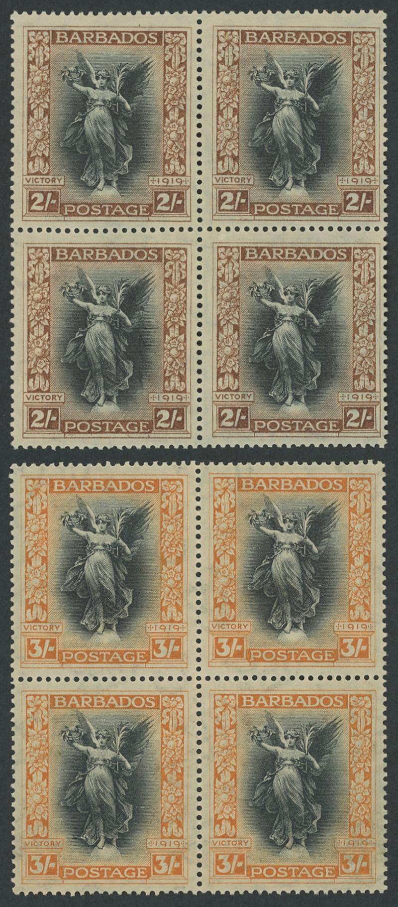 1920-21 Victory ¼d to 3/- set SG 201-211 blocks of 4 including 1d both watermarks plus extra shades of 2½d & 6d, centring a little variable otherwise very fine & all unmounted, Cat £640+ for mounted singles.