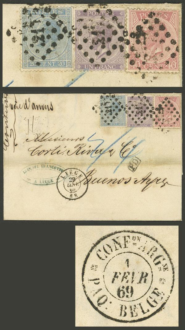 PAQUEBOT BELGE: 27/JA/1869 Liege - Buenos Aires, folded cover franked with 20c + 40c + 1Fr. stamps, with numeral "21" cancel along Liege datestamp, small framed "PD", and on back neat mark "CONFon ARGne - PAQ. BELGE - 1/FEV/69" perfectly applied, rare, excellent quality! (Image)