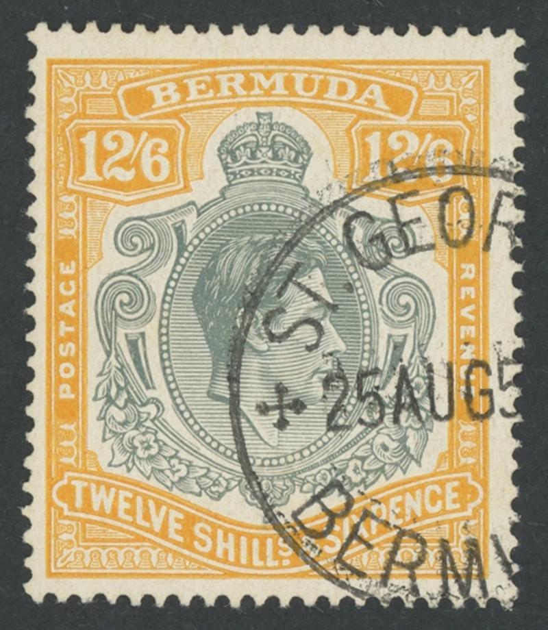 1938-53 KGVI Keyplates 12/6d grey & 'lemon' yellow SG 120d, partial St Georges 1950s cds cancel, Cat £450. (Image1)