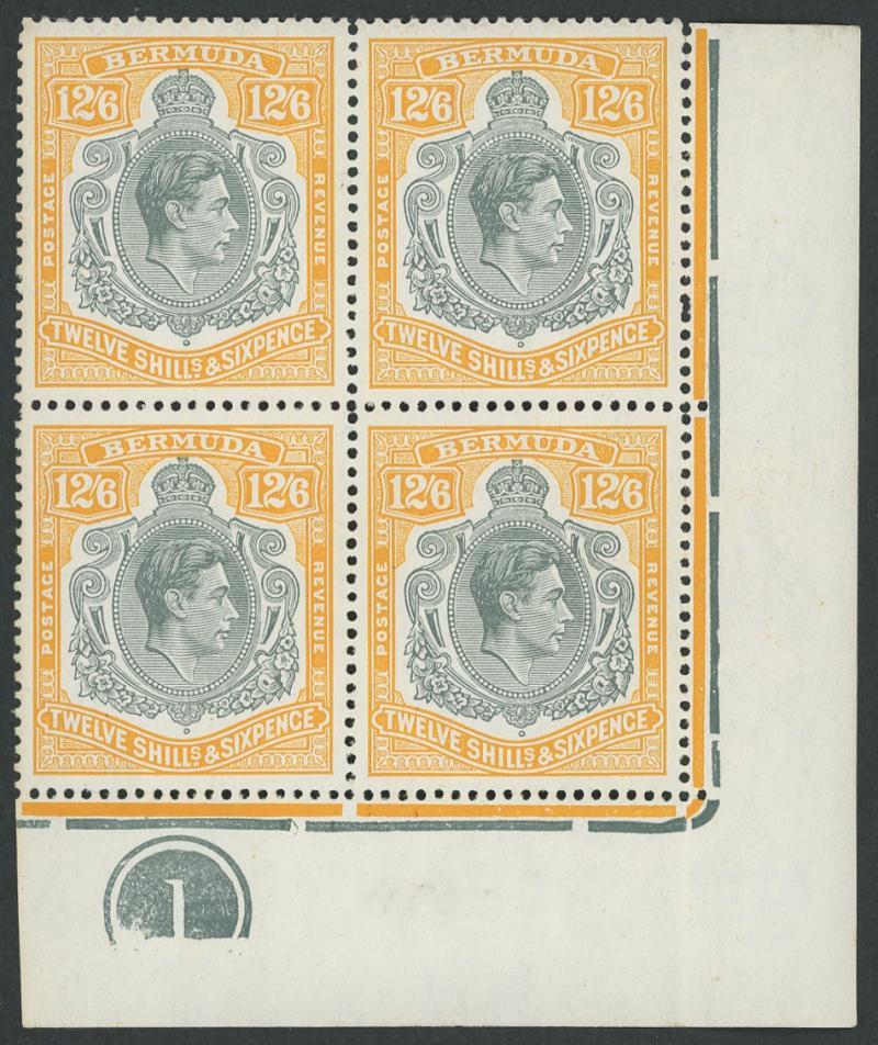 1938-53 KGVI Keyplates 12/6d grey & pale orange Chalk-Surfaced Paper SG 120e block of 4 from the lower-right corner of the sheet with Plate Number '1' in the lower margin, well-centred, unmounted, Cat £400+ for singles. [The illustration is above Lot 3166] (Image1)