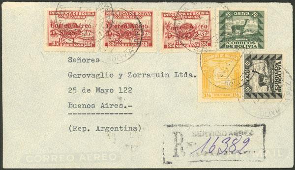 Registered airmail cover sent from La Paz to Argentina on 23/FE/1940 with very nice franking, VF quality! (Image)