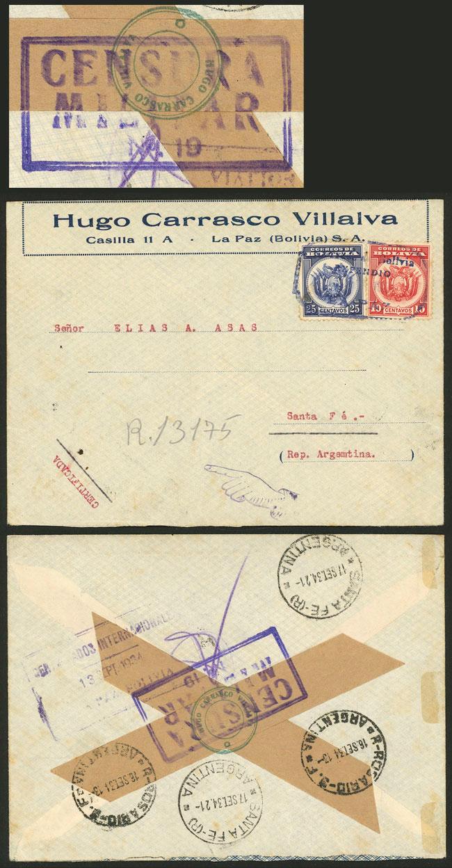 13/SE/1934 La Paz - Argentina, registered cover franked with 35c., on back there is an interesting censor mark of the Chaco War and transit and arrival marks, VF quality! (Image)