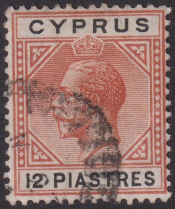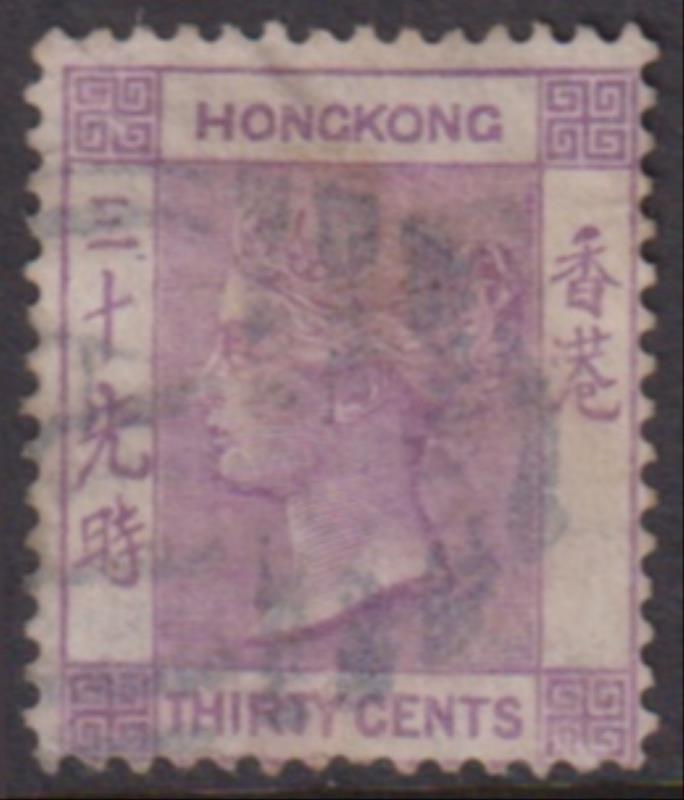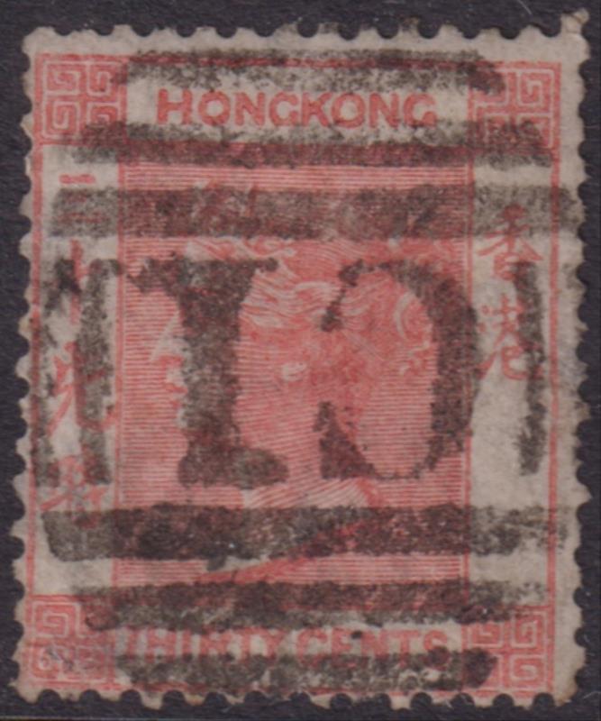 Hong Kong 1863-71 30c vermilion, crown CC wmk. A used example canc by bold strike of "C1" obliterator of Canton in black. Upside down strike but rare. SG Z143 (unpriced). (Image)