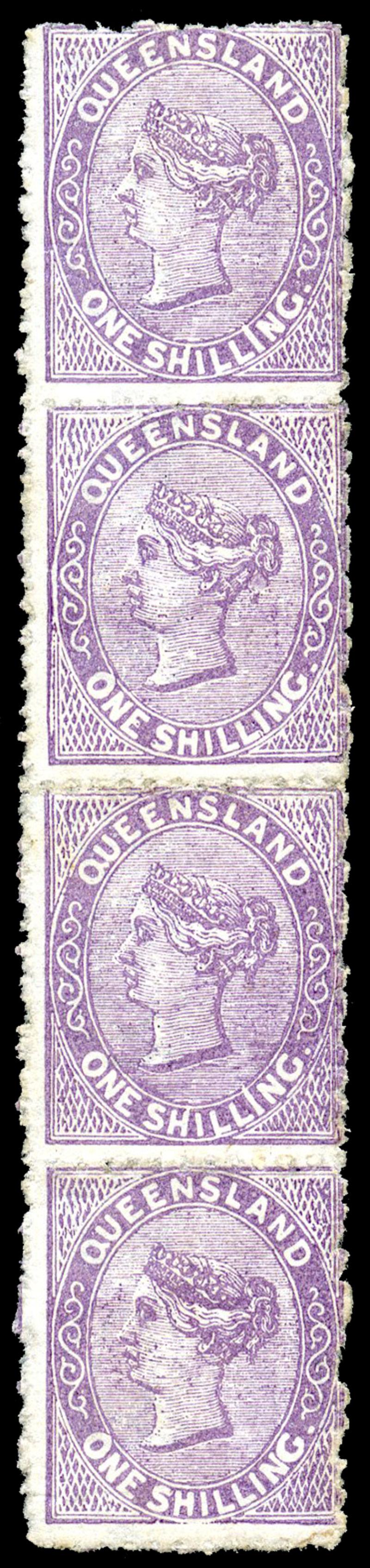 QUEENSLAND: 61: 1/- pale violet, strip of four, og, some foxing. (SG 145- £800) (Image)