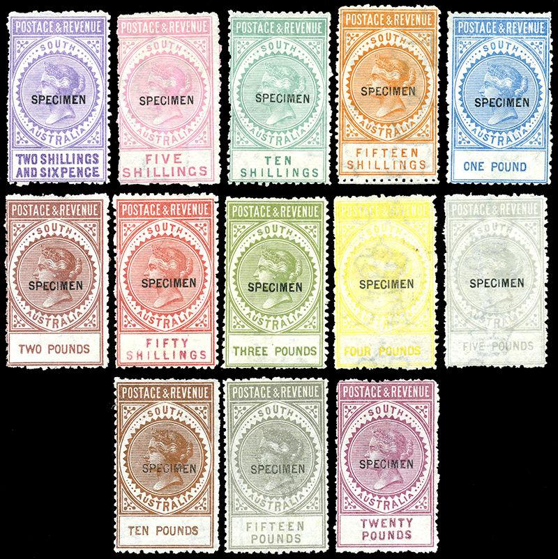 SOUTH AUSTRALIA: 81s-90s,91s-93s: 1886 2/6- to £20, 1886 13 vals complete, 15/- og, fresh and f-vf. (SG 195s204s,206s-208s £1400 for all 14) (Image)