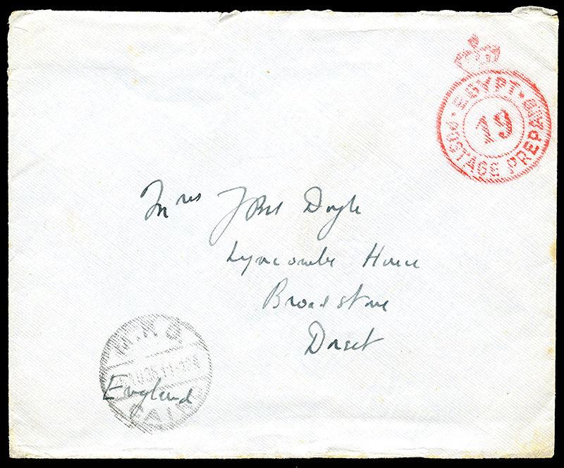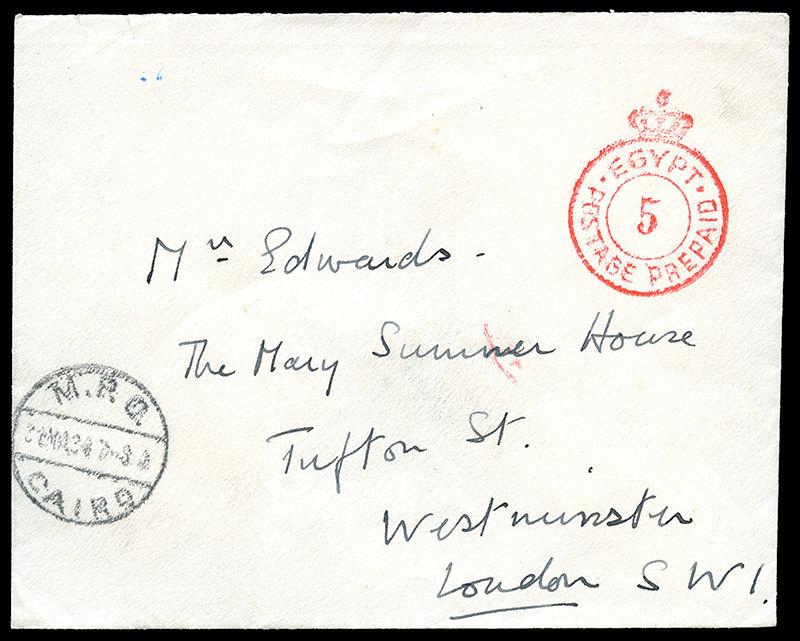 EGYPT - MILITARY: M3: 1pi 'POSTAL LETTER', on reverse of cover, with red Crown Cancel 5 and M.P.O. 3 MA 34 CAIRO, to London (ENGLAND), black adhesions on reverse. (Image)
