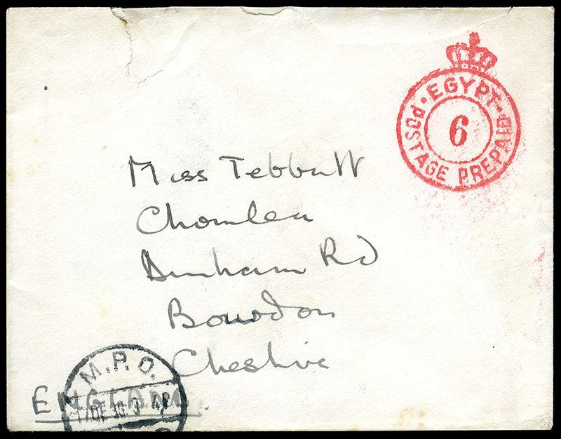 EGYPT - MILITARY: M3: 1pi 'POSTAL LETTER', on reverse of 'The King's Own' cover, with red Crown Cancel 6 and M.P.O. 17 DE 33 (CAIRO), to Cheshire (ENGLAND), black adhesions on reverse, opening tears. (Image)
