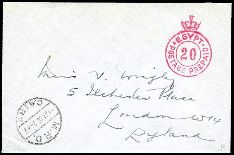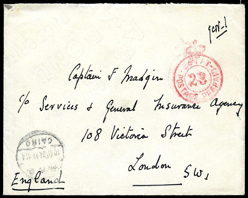 EGYPT - MILITARY: M7: 1pi green to reverse of cover, with red Crown Cancel 23 and M.P.O. 10 AP 3? CAIRO, to London ENGLAND, very fine (Image)