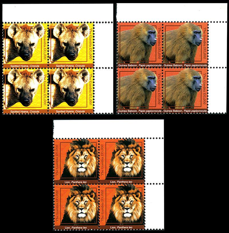 GAMBIA: 3736-3738: 2017 Mammals, 2000d to 5000d, cpl in UR corner margin blocks of 4, nh, very fine. RARE(Image)
