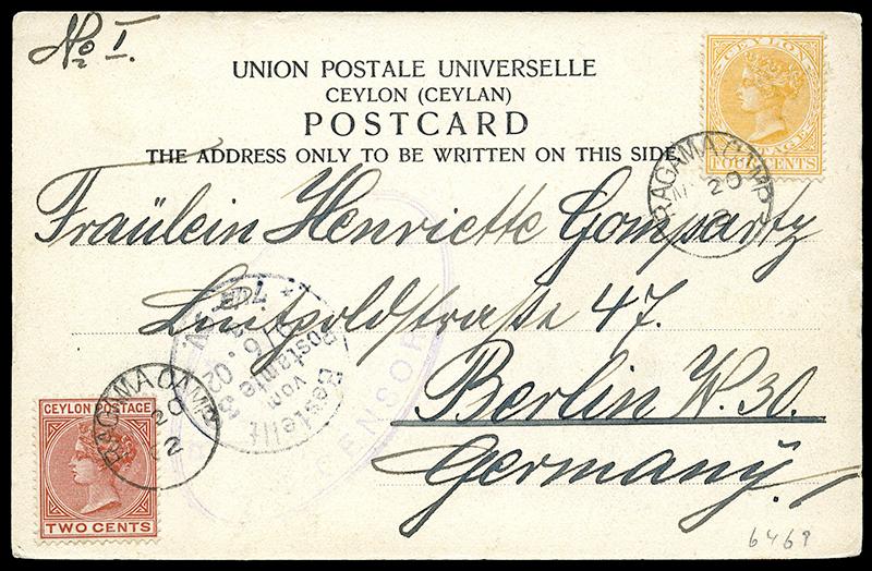 CEYLON: 87,91: 2¢ orange brown and 4¢ yellow, both fine and tied by RAGAMA CAMP 20 MY 02 cds to UPU PICTURE POST CARD showing BOER WAR PRISIONER OF WAR CAMP SCENE, violet oval CENSOR marking to GERMANY, from a POW interned there, most interesting. (Image)