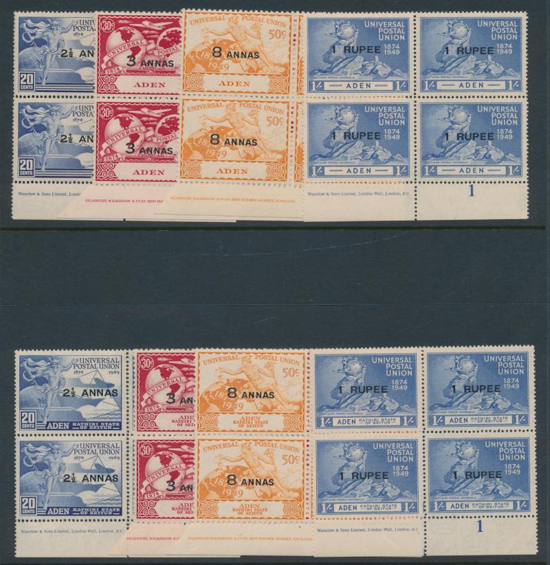 1949 UPU Omnibus complete sets in blocks of four with both Imprint and Plate Numbers ** for 65 territories, a few minor blemishes.
