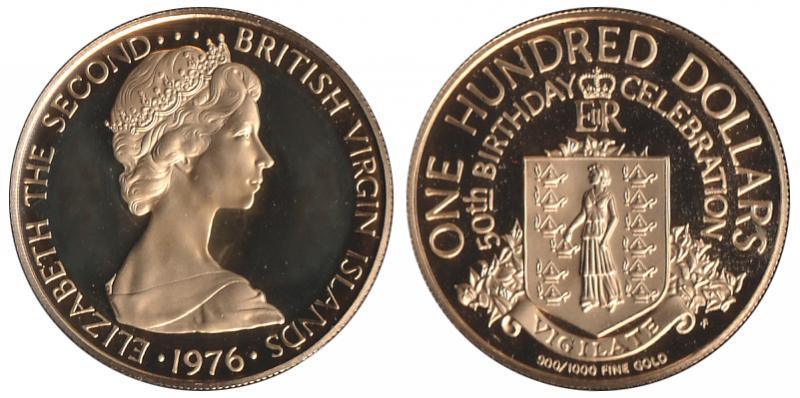 1976 $100 gold (7.10g 0.900) QEII 50th Birthday Proof KM 8 in Franklin Mint folder (aged). (Image1)