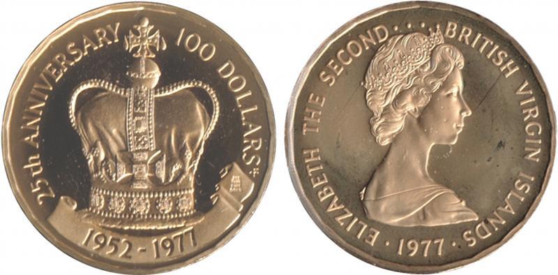 1977 $100 gold (7.10g 0.900) QEII Silver Jubilee Proof KM 15 in Franklin Mint folder (aged). (Image1)