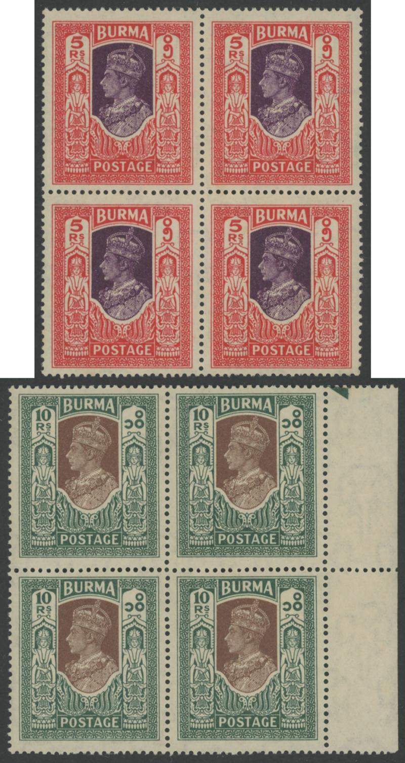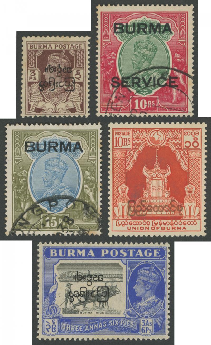 Collection to 1950s from 1937 Overprints on India KGV 3p to 10r set including 3a6p dull blue * plus 2r to 15r (minor aging marks) used and 'BURMA/SERVICE' overprints 6a to 5r * plus the complete set used (5r with 'TEL' cds), 1938-40 KGVI Pictorials set * & used plus 'SERVICE' overprints set * & used, 1945 British Military Administration overprints set in blocks of 4 **, 1946 Civil Administration set in blocks of 4 ** & used singles plus 'SERVICE' overprints set * and 2r used, 1947 Interim Government overprints used in blocks of 4 plus Overprint Inverted 3p & 3a6p * and 'SERVICE' overprints set * & used, also Union of Burma 1949 Independence Anniversary set ** & used plus eleven values with unissued 'Pyidaungsu' control overprint and official overprints set *, 1954 New Currency set * & used plus official overprints set *, etc, condition a little variable but mostly fine to very fine, Cat £4000+ plus unlisted varieties & unissued items.