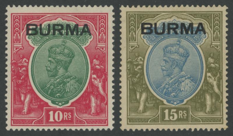 OFFICIAL STAMPS: 1937 Overprints on India KGV Heads 'BURMA/SERVICE' Overprints 3p to 10r set SG O1-O14, the 5r & 10r well-centred, most including these with small hinge remainders, Cat £1000 for unmounted (Murray Payne Cat (2015) £450 for mounted).