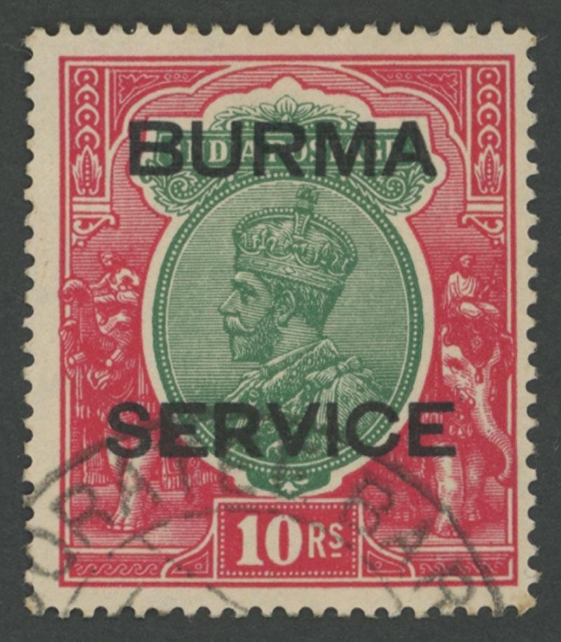 OFFICIAL STAMPS: 1937 'BURMA/SERVICE' Overprints on India KGV 10r green & scarlet SG O14, partial '[S]OORATEE BAR[A BAZAAR]' (Rangoon) postal cds cancel, Cat £375. (Image1)