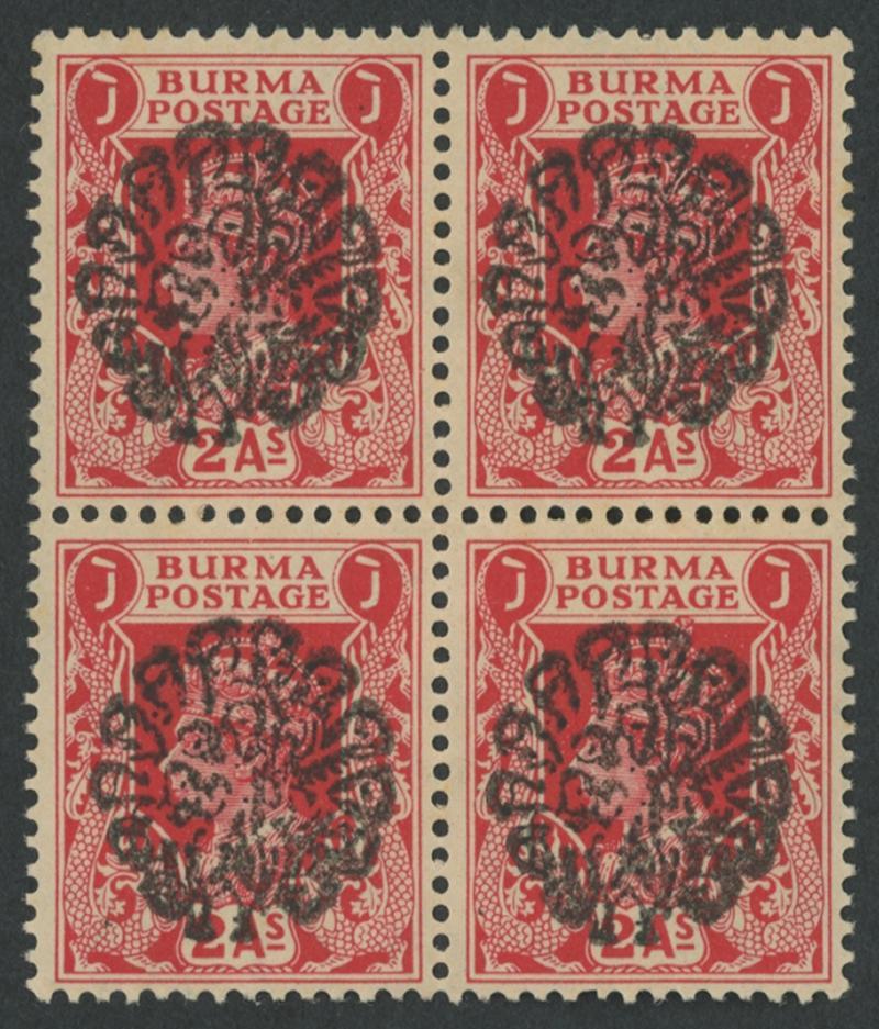 JAPANESE OCCUPATION: 1942 Peacock Type 6 Handstamp (at Pyapon?) on KGVI 2a carmine SG J20 block of 4, well-centred, unmounted, Cat £600+ for singles. Not expertised, and so necessarily offered 'as is'. (Image1)