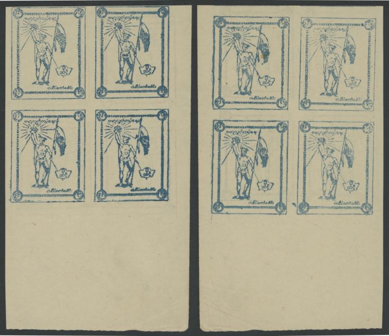 JAPANESE OCCUPATION: 1943 Independence Day Soldier 1c orange & Peasant 3c blue as SG J82 & J83 but Printed Both Sides both in blocks of 4, the latter marginal from the base of the sheet with a light corner crease at base well clear of the stamps, no gum as issued, Cat £144+ for normal singles.