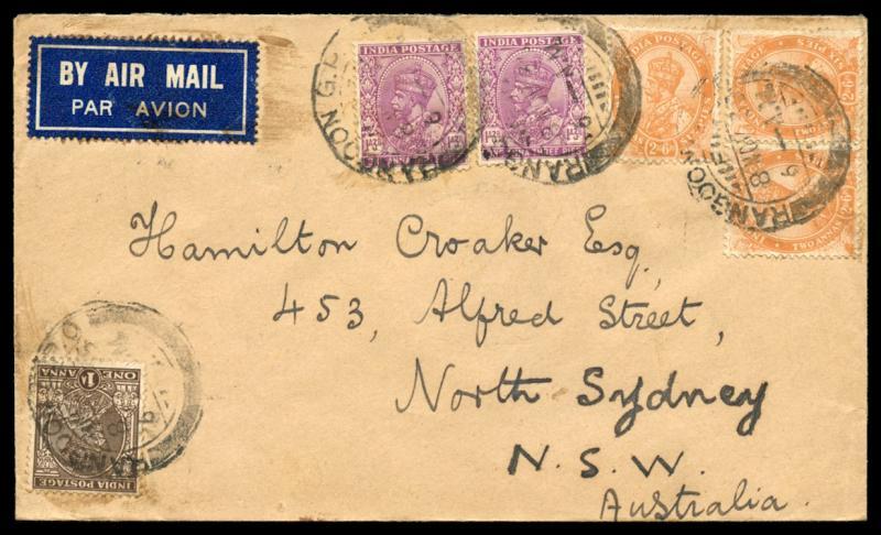 1935-36 group all airmail to the same addressee in North Sydney, Australia from Rangoon or Taunggyi x4 with various KGV Definitives paying 2½a letter rate plus either single or double 8½a per ½oz airmail surcharge, all with Sydney or North Sydney arrival backstamps, mostly fine.