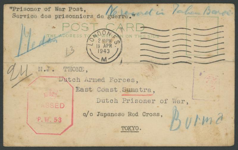 1943 (Apr 19) plain postcard to "Dutch Armed Forces/East Coast Sumatra/Dutch Prisoner of War" with London machine & British censor in rosine, endorsed "Medan", "no record in Pakan Barao" and finally "Burma", light Japanese censor in violet & faint han of Asanamura in rosine, a few faults consistent with being received on the infamous Burma-Siam Railway. (Image1)