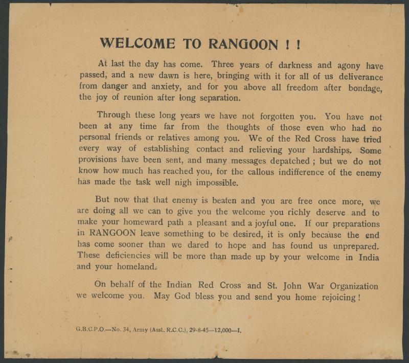 1945 (Aug 29; printers' imprint at the base) black/brown 'WELCOME TO RANGOON ! !' Red Cross leaflet for distribution to released POWs, light central fold & a bit fragile. We expect the survival rate was very small. (Image1)