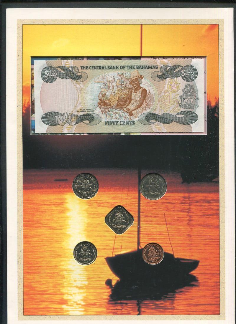 image Bahamas, Coins and Note Issue in Presentation pack, Est. Cat. $50, UNC 50c bank note, 1995 1c, 1987 5c, 1991 10c, 1992 15c, 25c 1991 (some toning) (Image)