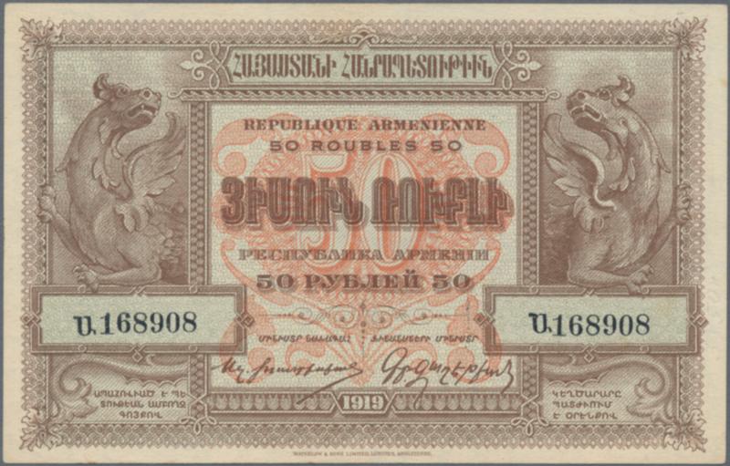 Armenia République Armenienne, lot with 3 banknotes 50 Rubles 1919 (P.30, UNC), 100 Rubles 1919 (P.31, aUNC with minor spots) and 250 Rubles 1919 (P.32, VF/VF+ larger stain and tiny dint upper and lower left). (3 pcs.) Catalog number(s): Pick 30-32 (Image)