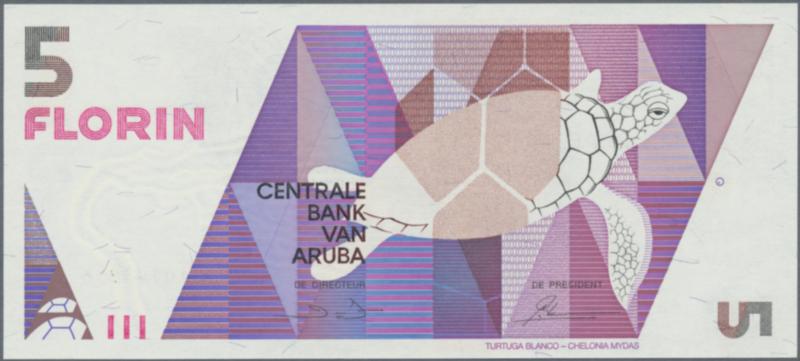 Aruba Centrale Bank van Aruba, very nice lot with 7 banknotes, 1990-2003 series, with 5, 10, 25 and 50 Florin 1990 (P.6-9, UNC), 10 Florin 1993 (P.11, UNC) and 10 and 25 Florin 2003 (P.16a, 17a, UNC). (7 pcs.) Catalog number(s): Pick 6-9, 11, 16a, 17a (Image)