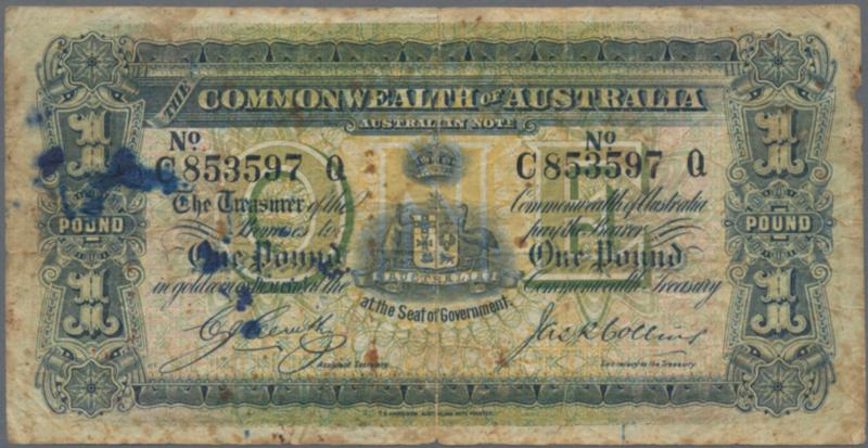 Australia The Commonwealth of Australia – Treasury, 1 Pound 1918 with signatures Cerutty & Collins, P.4d, very rare and popular banknote with a few stains of blue ink left center, rusty spots and margin split, Condition: VG/F-. Highly Rare! Catalog number(s): Pick 4d (Image)