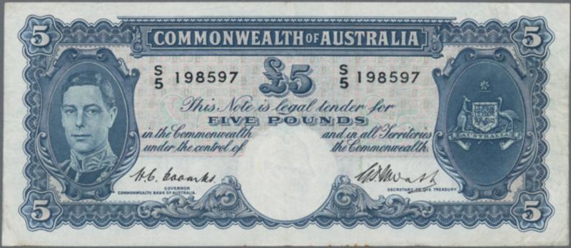 Australia Commonwealth Bank of Australia, 5 Pounds ND(1939-52) with signatures: Coombs & Watt, P.27c, very nice with a few rusty spots, obviously cleaned and pressed, Condition: VF. Catalog number(s): Pick 27c (Image)