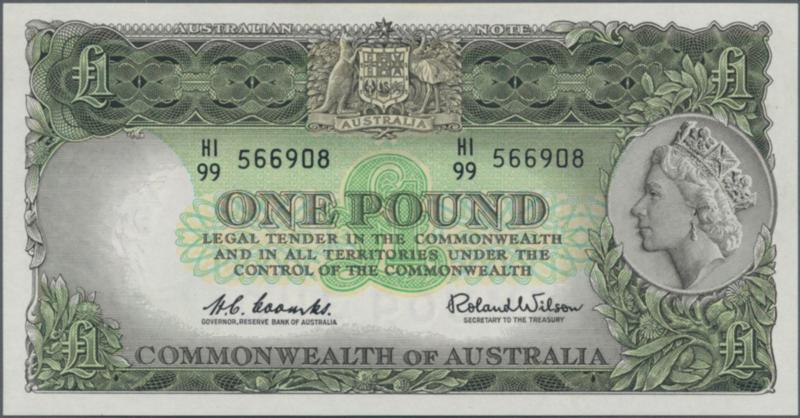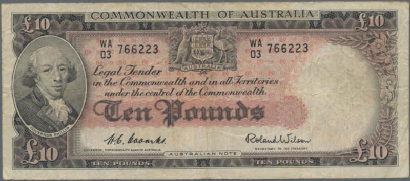 Australia Commonwealth Bank of Australia, 10 Pounds ND(1954-59), P.32, still nice with lightly toned paper, some spots and tiny hole at center, Condition: F/F-. Catalog number(s): Pick 32 (Image)