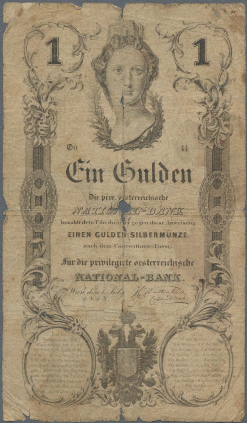 Austria Lot with 7 banknotes, 1800-1888 series, including for the Gemeinde Stadt Wien / Banco Zettels Haupt-Kasse 5 Gulden 1800 (P.A31, F, small tears and remnants of tape on back) and 5 Gulden 1806 (P.A38, VF, minor margin split and lightly toned paper), Privilegirte Oesterreichische National-Bank with 1 Gulden 1848 (P.A81, G/VG, border tears and hole at center), 1 Gulden 1858 (P.A84, F/F+), K.u.K. Hauptmünzamt 10 Kreuzer 1860 (P.A93a, VG/F-) and K.u.K. Reichs-Central-Casse 1 Gulden 1882 (P.A153, VF+) and 1 Gulden 1888 (P.A156, F+). Very nice set! (7 pcs.) Catalog number(s): Pick A31, A38, A81, A84, A93, A153, A156 (Image)