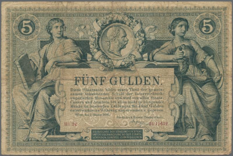 Austria K.u.K. Reichs-Central-Casse, pair with 1 Gulden 1888 (P.A156, F/F-) and 5 Gulden 1881 (P.A154, F- with stained paper and tiny hole at center). Nice pair! (2 pcs.) Catalog number(s): Pick A154, A156 (Image)