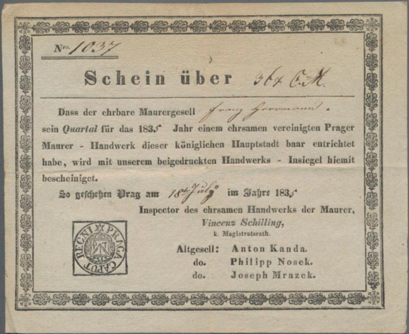Austria Prag, Inspector des ehrsamen Handwerks der Maurer, Quittung / Schein Nr. 1037 über den Erhalt von 367 C.M. vom 18. Juli 1835. Schönes Zeitzeugnis. Catalog number(s): Pick A unl. This lot is "Gebotslos". The Minimum Bid is 20 €, it will be sold at the HIGHEST BID (not one bidding step above the second highest bid). (Image)