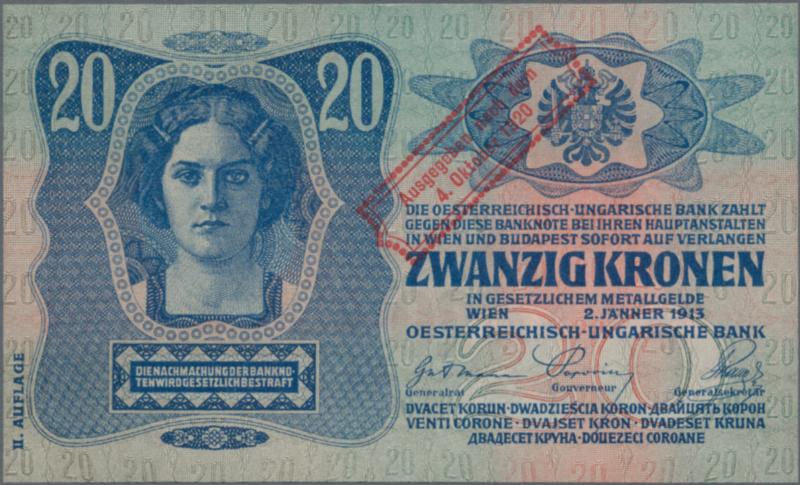 Austria Oesterreichisch-Ungarische Bank, 20 Kronen 1913 (1920), II. Auflage with additional overprint "Ausgegeben nach dem 4. Oktober 1920", P.45 in UNC condition. Catalog number(s): Pick 45 (Image)