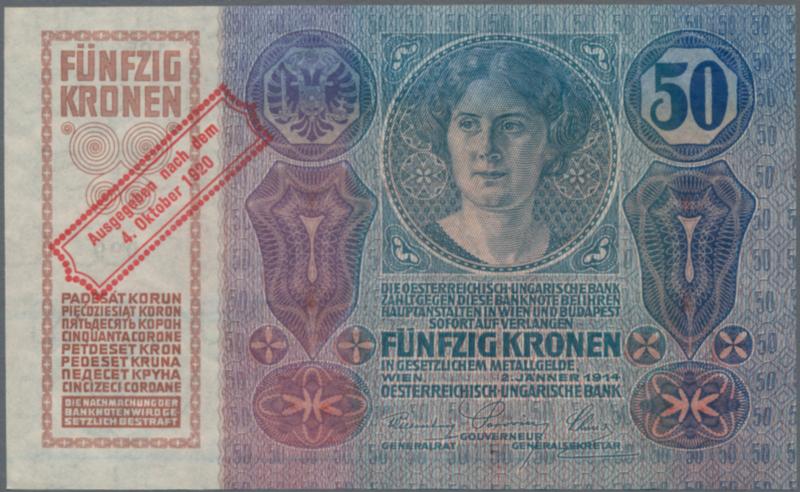 Austria Oesterreichisch-Ungarische Bank, 50 Kronen 1914 (1920) with additional overprint "Ausgegeben nach dem 4. Oktober 1920", P.46 in UNC condition. Catalog number(s): Pick 46 (Image)