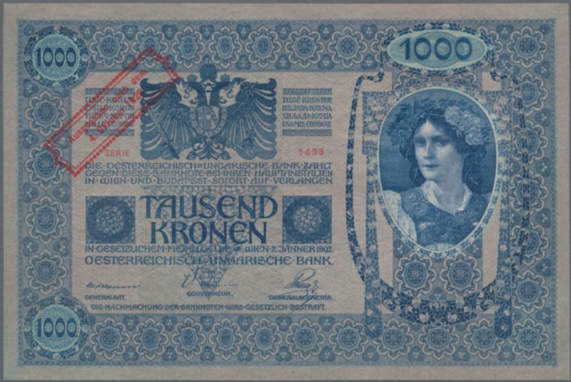 Austria Oesterreichisch-Ungarische Bank, 1.000 Kronen 1902 (1919) with additional stamp "ECHT - Oesterreichisch-ungarische Bank / Hauptanstalt Wien", P.58, some folds and a few minor spots, Condition: VF. Catalog number(s): Pick 58 (Image)