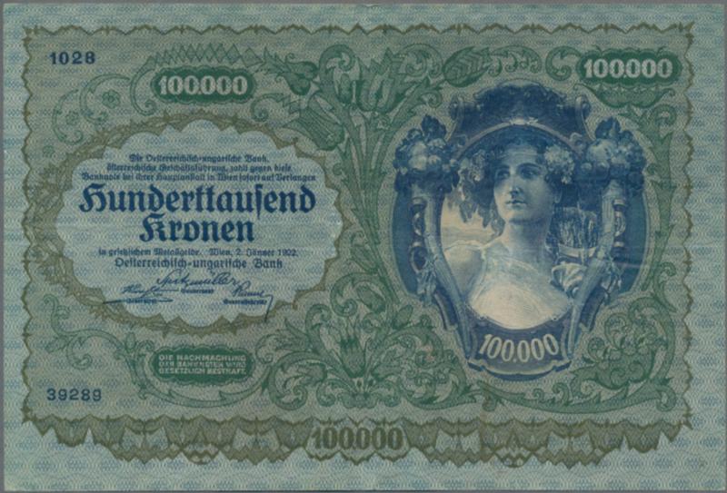 Austria Lot with 8 notes, including 100.000 Kronen 1922 P. 81, center fold, corner bend, small tears at the bottom, crispness in paper and original colors (VF); 5.000 Kronen 1922, P.79 (F+); 1000 + 100 Kronen 1922; Deutschösterreich 2 x 10.000 Kronen, 1 x 1.000 Kronen and 1 x 100 Kronen(VF). Catalog number(s): Pick 81 u.a. (Image)