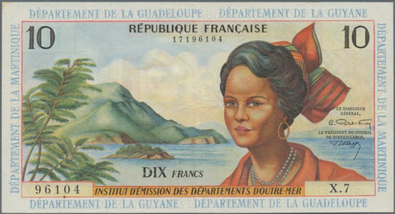 French Antilles Institut d'Émission des Départements d'Outre-Mer, 10 Francs ND(1964) with signatures: André Postel-Vinay & Bernard Clappier, P.8b, very nice and still crisp paper, some soft folds and a few minor spots, Condition: VF/VF+. Catalog number(s): P. 8b This lot is "Gebotslos". The Minimum Bid is 20 €, it will be sold at the HIGHEST BID (not one bidding step above the second highest bid). (Image)