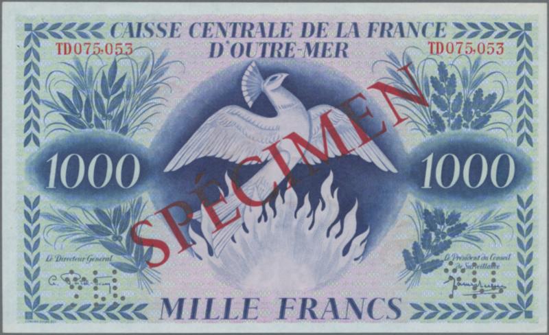 French Equatorial Africa 1000 Francs 2.2.1944, SPECIMEN, P. 19as, upper left two pinholes, AU/UNC Catalog number(s): P. 19 as (Image)
