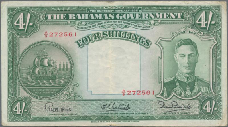Bahamas 4 Shillings 1936, P. 9e, F, added: Costa Rica 2 Colones 1967, P. 235 (VF), 20 Colones 1983 P. 252 (AU), Falkland, 1 Pound 1.12.1977, P. 8 b, VG, Venezuela, 5 Bolivares 1966, P. 49, small stains, AU, Catalog number(s): P. 9 e (Image)