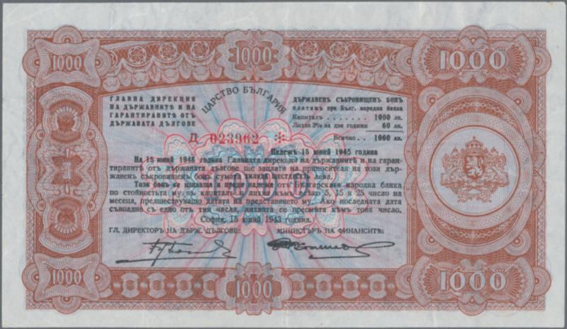 Bulgaria - Bank notes 1000 Leva 15.6.1943, P. 67 I, VF Catalog number(s): P. 67 I (Image)