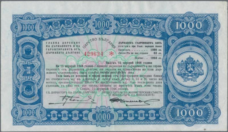 Bulgaria - Bank notes 1000 Leva 15.1.1944, P. 67 K, VF Catalog number(s): P. 67 K (Image)