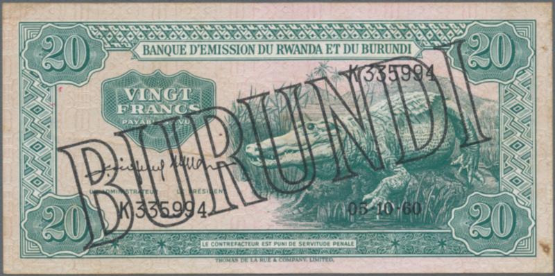 Burundi 20 Francs ND (1964), P. 3, small stains, VF Catalog number(s): P. 3 (Image)