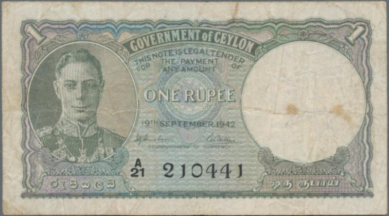 Ceylon 1 Rupee 9.9.12942, 4.8.1943, 24.6.1945, 2 Rupees 20.12.1941, P. 34, 35 a, VG-F Catalog number(s): P. 34 (Image)