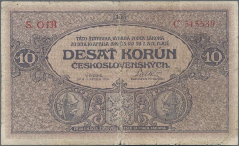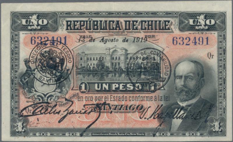 Chile Republica de Chile, 1 Peso 1919 (P.15b, XF) and Banco Central de Chile 10 Pesos 1930 (P.83b, F). (2 pcs.) Catalog number(s): P. 15b, 83b (Image)